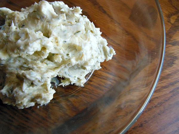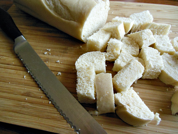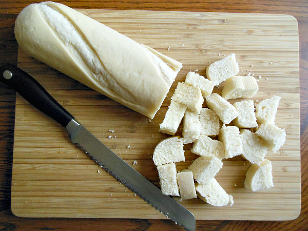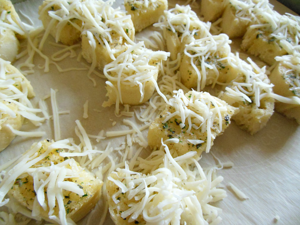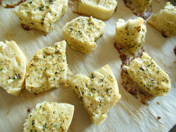 Mix the garlic spread ingredients (recipe here) and cover the bread chunks in it.
